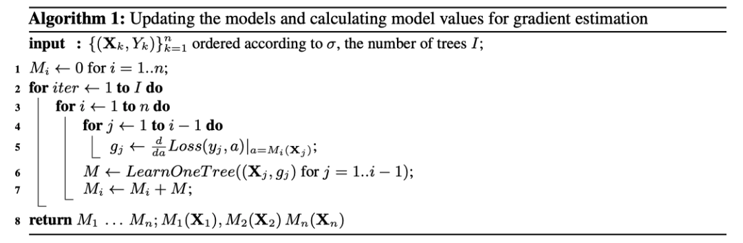 设 为构建 棵树后的模型, 为构建 棵树后第 个训练样本上面的梯度值。 为了使得 无偏于模型 ,我们需要在没有 参与的情况下对模型 进行训练。 由于我们需要对所有训练样本计算无偏的梯度估计,乍看起来对于 的训练不能使用任何样本,貌似无法实现的样子。 我们运用下面这个技巧来处理这个问题: 对于每一个样本 ,我们训练一个单独的模型 ,且该模型从不使用基于该样本的梯度估计进行更新。 我们使用 来估计 上的梯度,并使用这个估计对结果树进行评分。 用伪码描述如下,其中 是需要优化的损失函数, 是标签值, 是公式计算值。Prediction shift