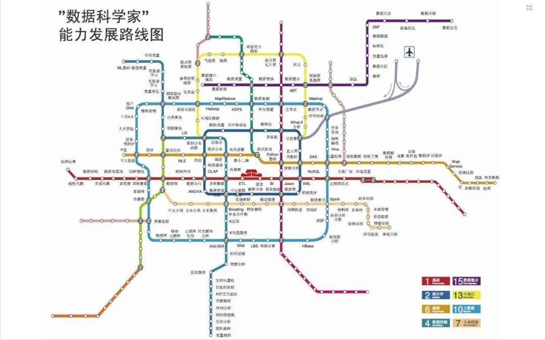 无独有偶,国内的高手们画了一张类似的图,只不过叫做“数据科学家能力发展路线图”。