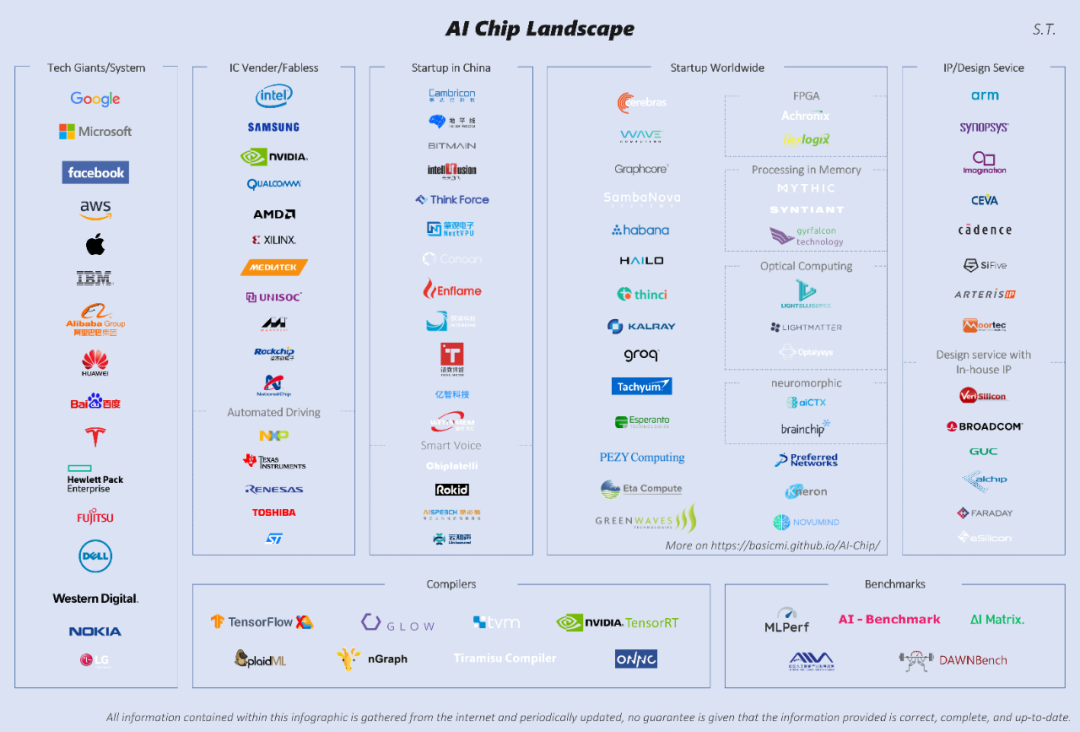始于硬件芯片,止于云服务,中间可能还可以分为更多的层次。AI芯片多用于硬件加速,很多企业也都在这个领域发力,例如 百度的NLP芯片——鸿鹄,一张AI芯片的不完整统计图如下:
