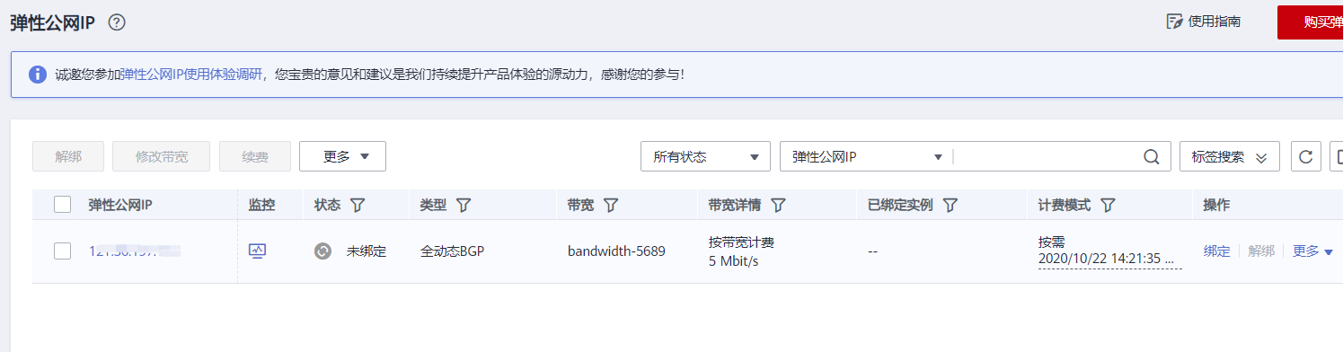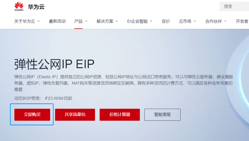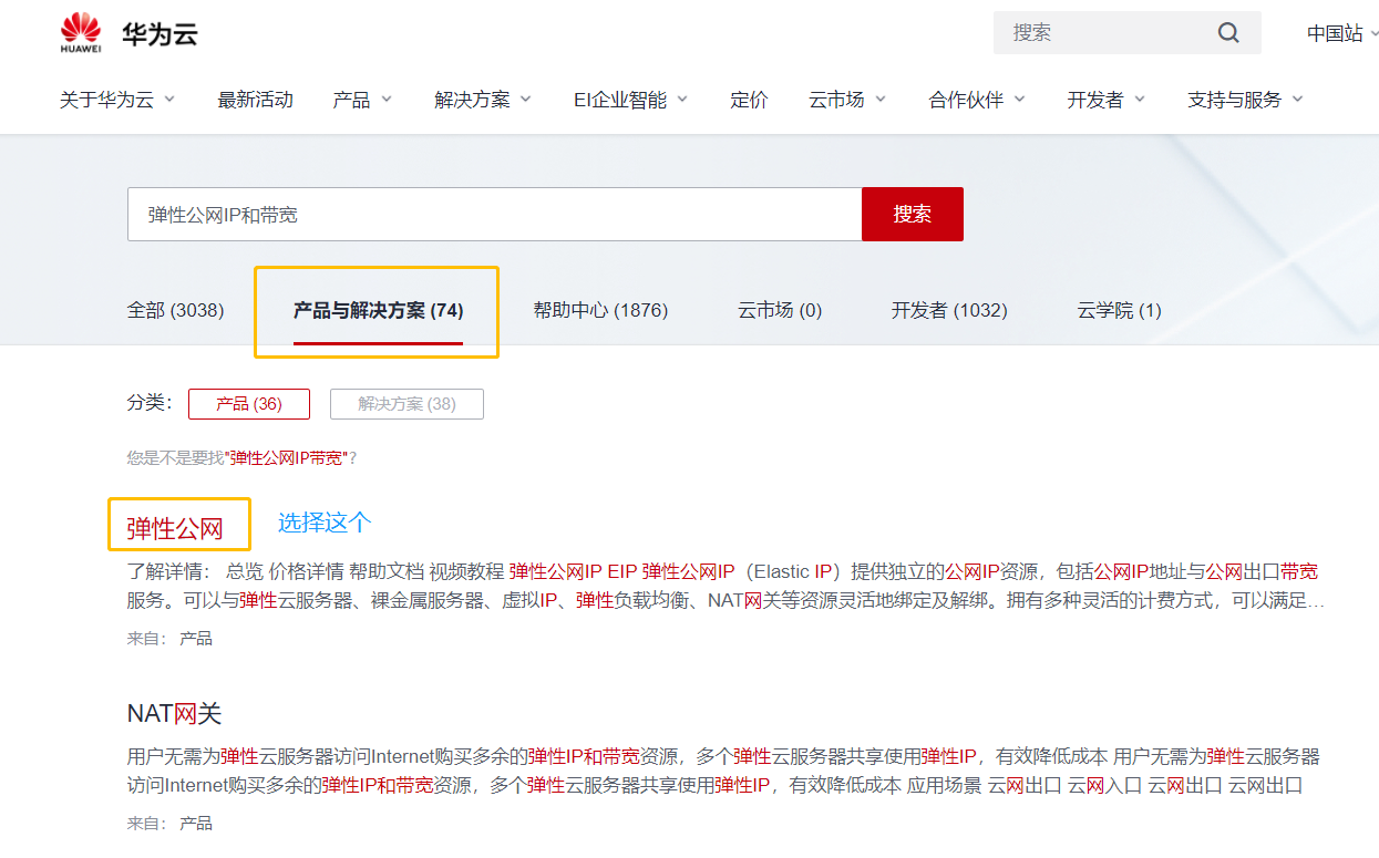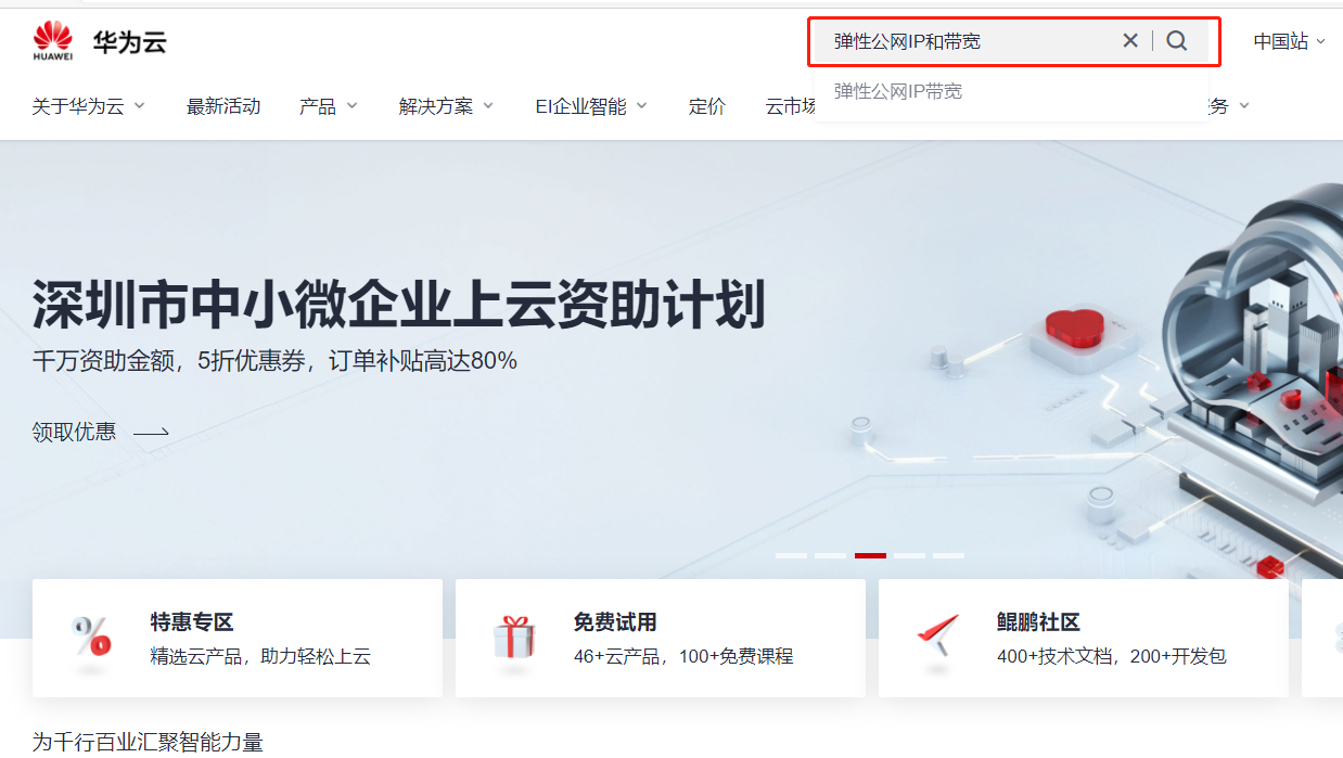 来到华为云的主页,使用搜索功能,输入”弹性公网IP和带宽“进行搜索