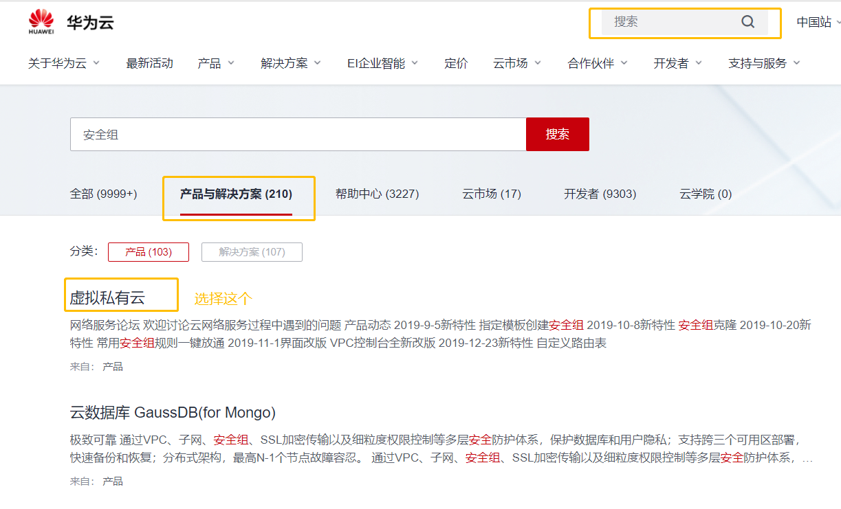 2.1)进入安全组,同样的方法,在华为云的主页,使用搜索功能,输入”安全组“进行搜索