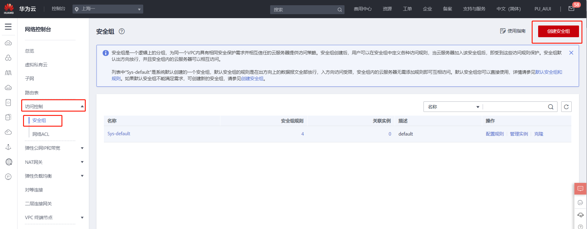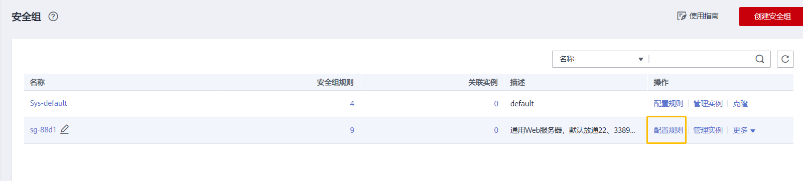 系统会为每个用户默认创建一个默认安全组,默认安全组的规则是在出方向上的数据报文全部放行,入方向访问受限,安全组内的弹性云服务器无需添加规则即可互相访问。