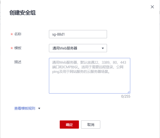 创建安全组:点击右上角“创建安全组”,命名安全组,下拉框选择企业项目,模板默认,点击“确定”,创建安全组。