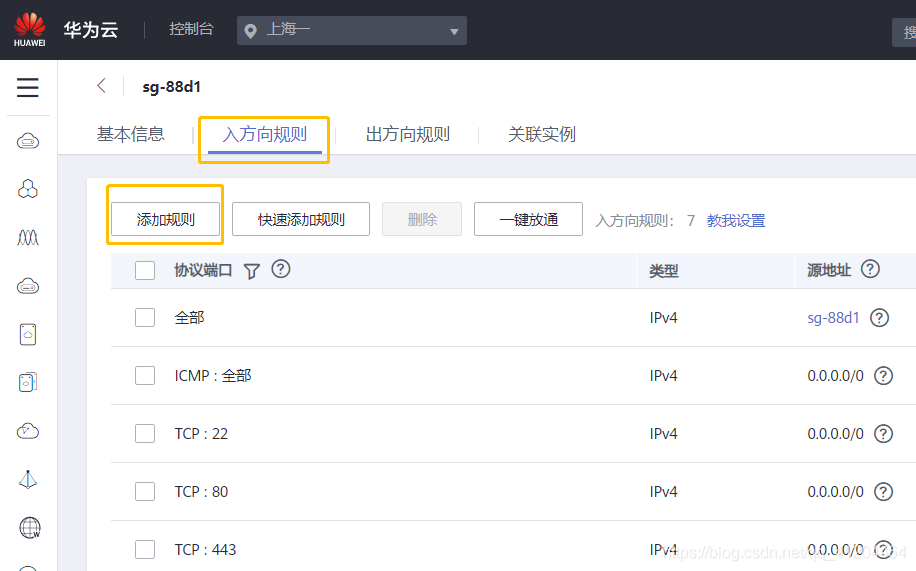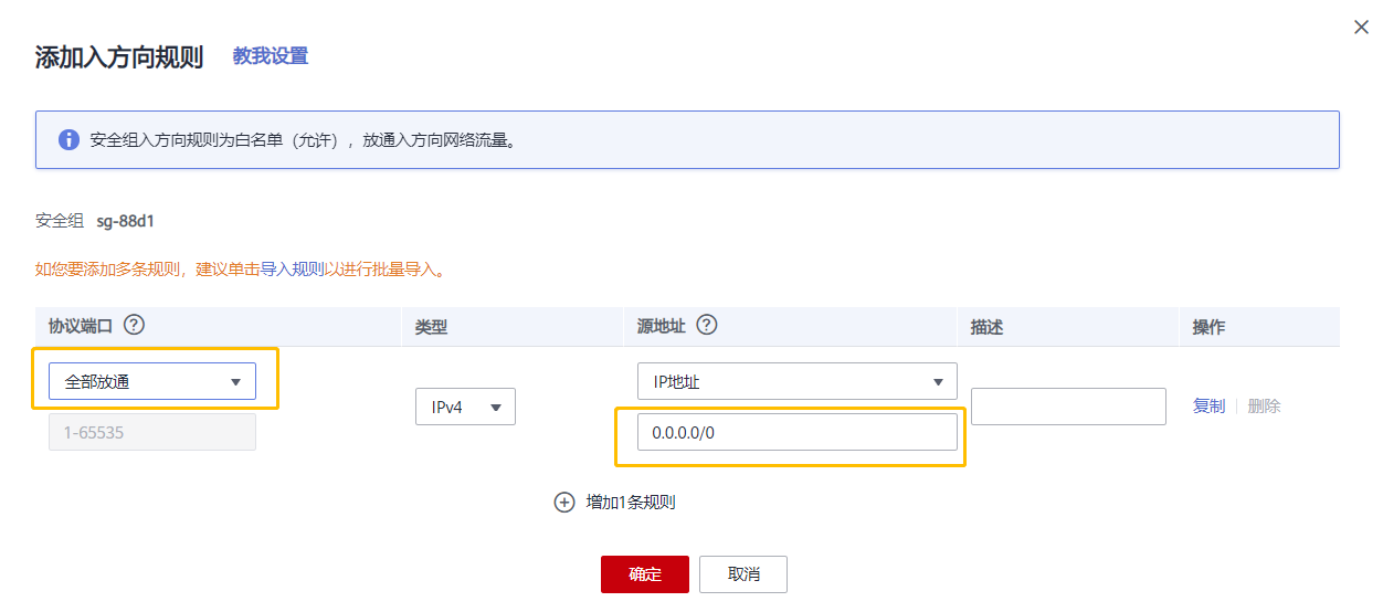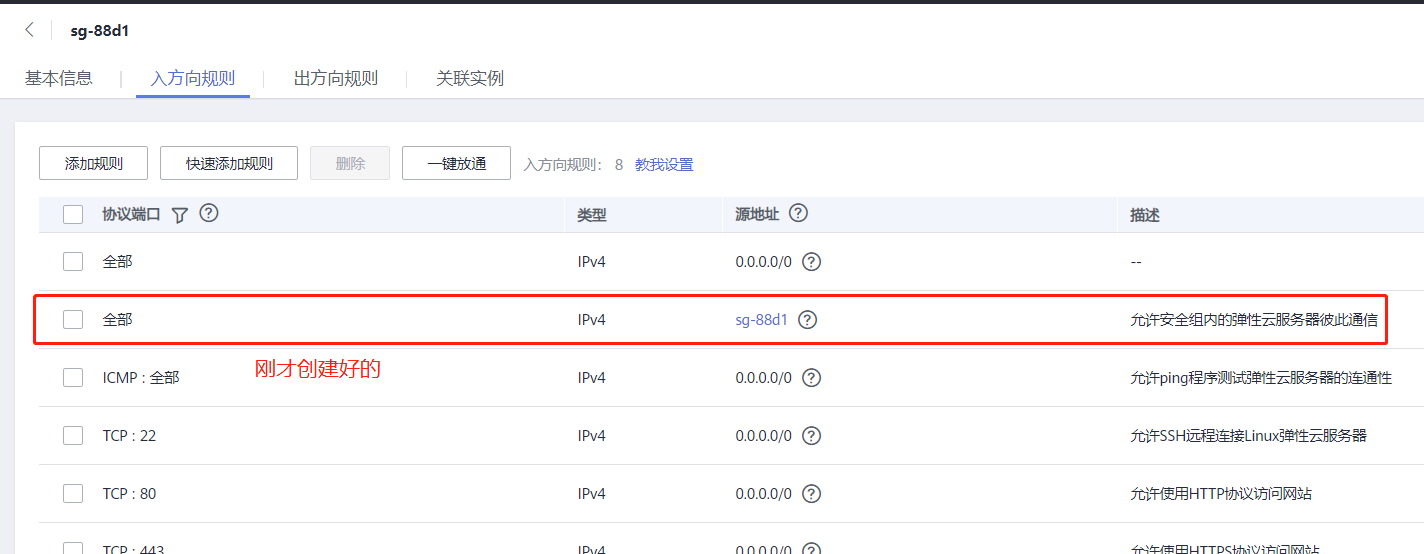 点击“入方向规则”->“添加规则”,并按下图添加入方向规则,