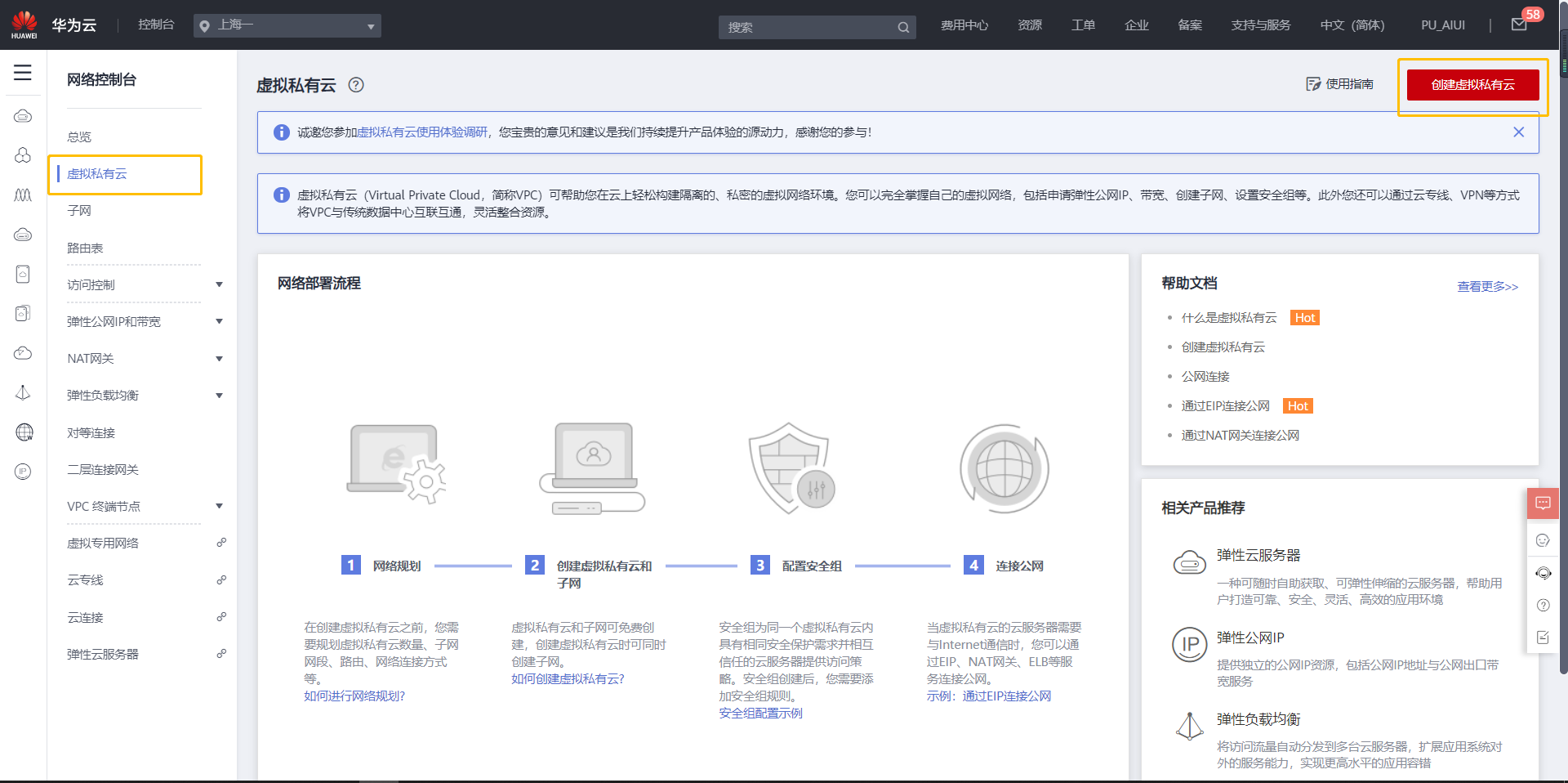 虚拟私有云(Virtual Private Cloud,以下简称VPC),为弹性云服务器构建隔离的、用户自主配置和管理的虚拟网络环境,提升用户云中资源的安全性,简化用户的网络部署。