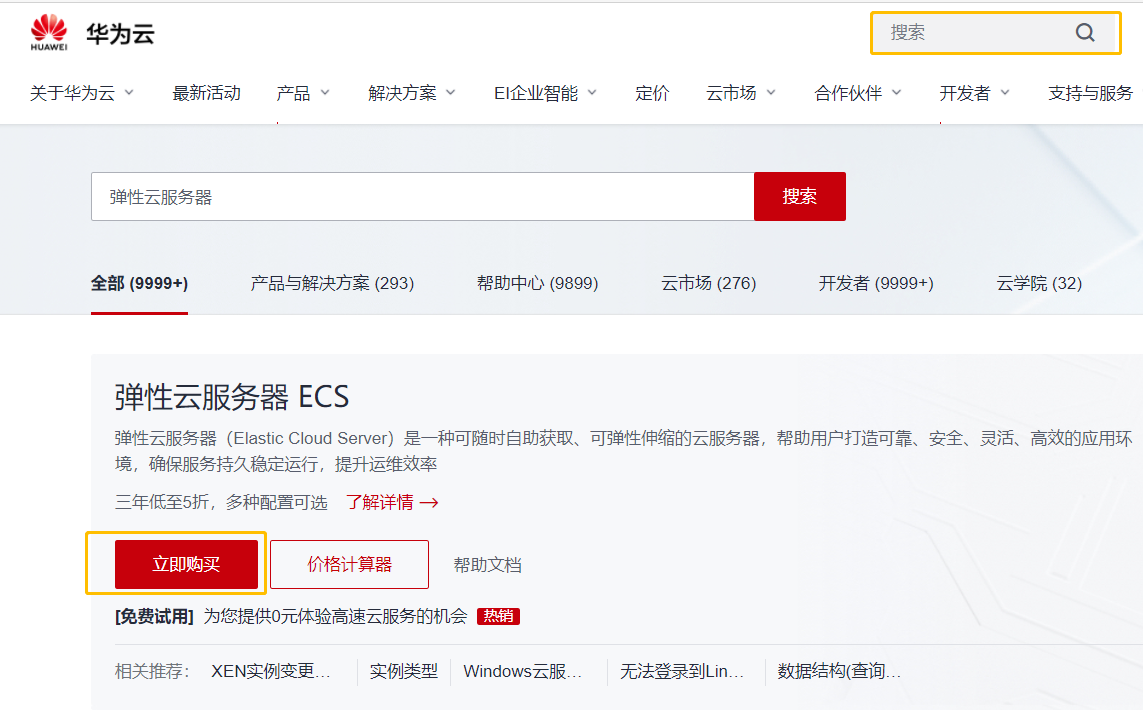 使用搜索功能,输入”弹性云服务器“进行搜索