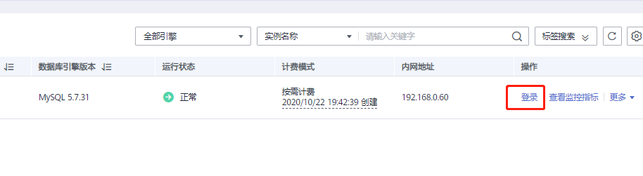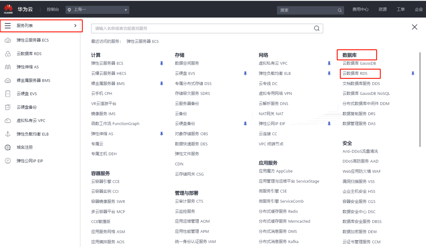 于华为云控制台,鼠标移动到云桌面浏览器页面中左侧菜单栏,点击服务列表->”数据库”->“数据库RDS”,进入左侧栏 “实例管理”界面,如下图所示: