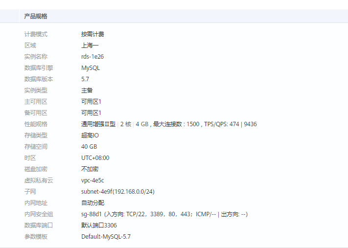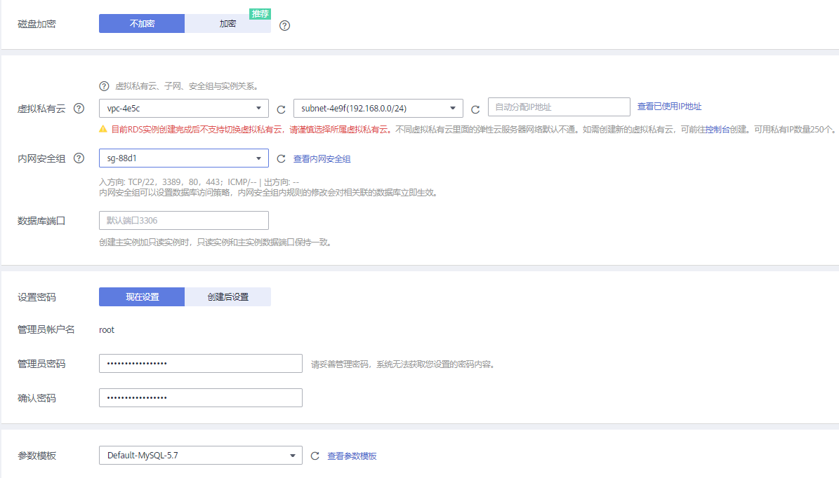 ① 继续按下图配置相关信息,确保数据库使用的VPC、子网、内网安全组均使用之前1/2/3步骤中创建的实例;