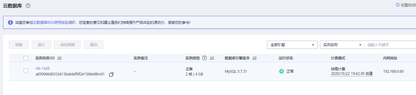 确认购买;然后点击“返回云数据库RDS列表”返回数据库实例列表,此处需要等待一段时间【约6分钟】,需要耐心等待。