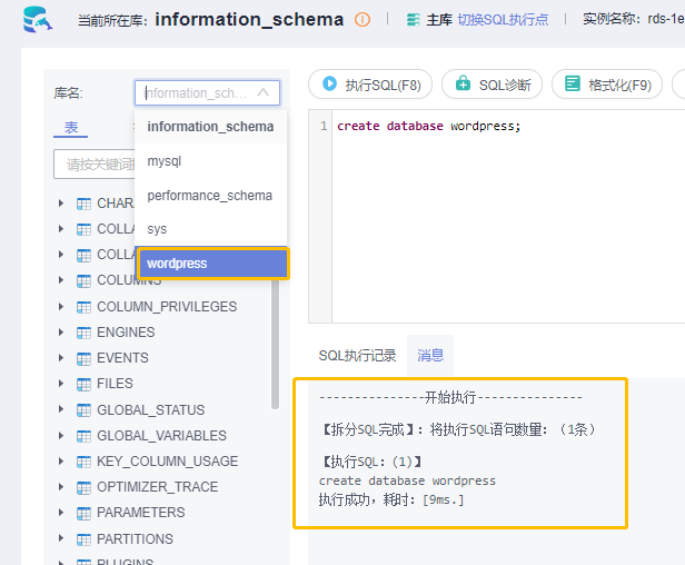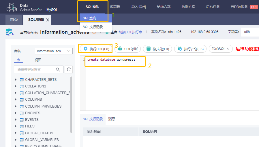 根据步骤6.3)创建的数据库用户名(用户名:root)和所设置的密码登录MySQL并创建WordPress数据库。