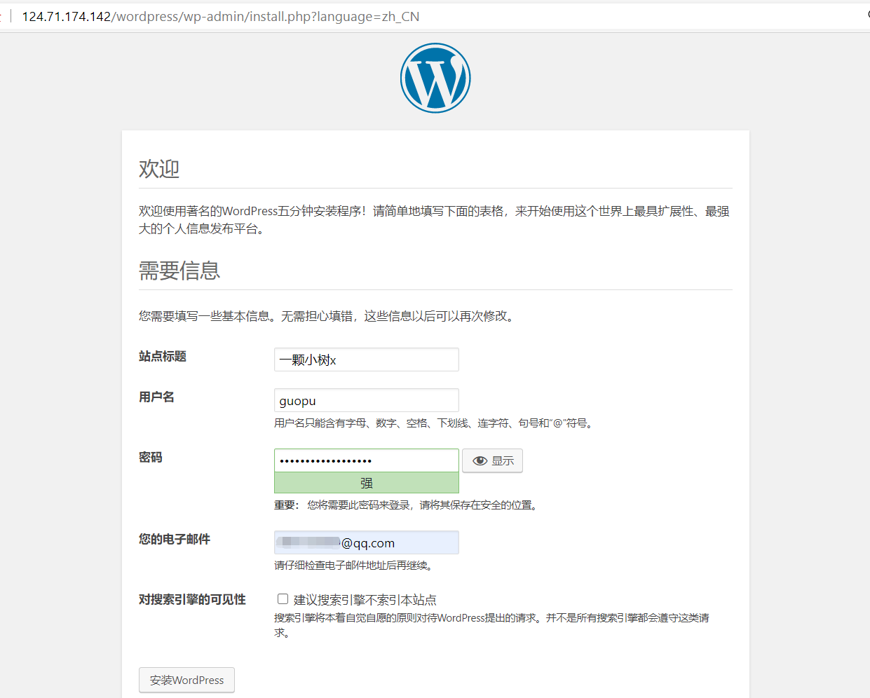 设置站点标题、用户名、密码及电子邮件后,然后点击“安装WordPress”,如下图所示: