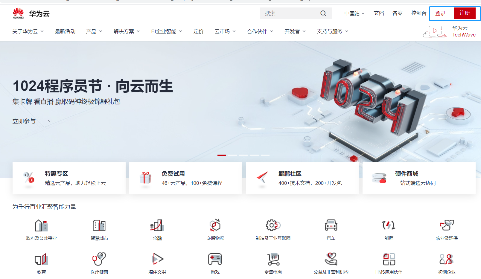 如果没注册华为云账号的朋友,先进行注册并通过实名认证;登录和注册按钮在右上角。
