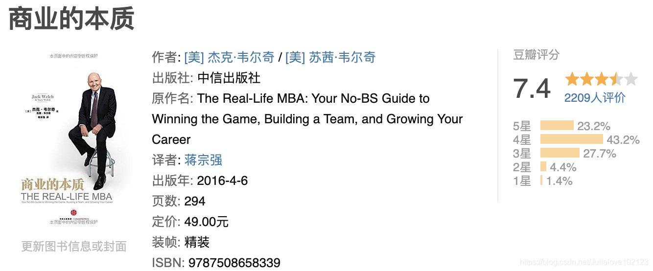 《商业的本质》是杰克•韦尔奇对过去十几年商业变革的反思和总结。他指出,科技革命给市场带来了巨大变化和诸多杂音,但作为管理者,不能迷失商业中最核心的东西。在当今的新商业环境下,要想“赢”,就必须遵从商业的规则,回归商业的本质。