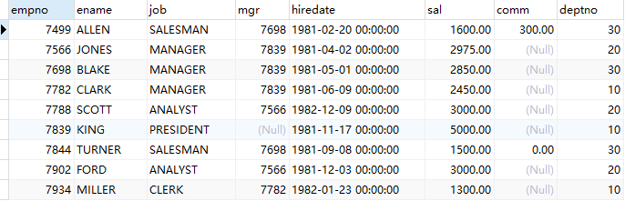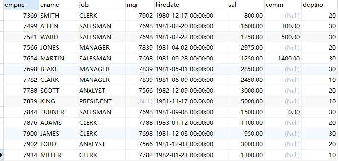 INSERT INTO `emp` VALUES (7900, 'JAMES', 'CLERK', 7698, '1981-12-03 00:00:00', 950.00, NULL, 30);