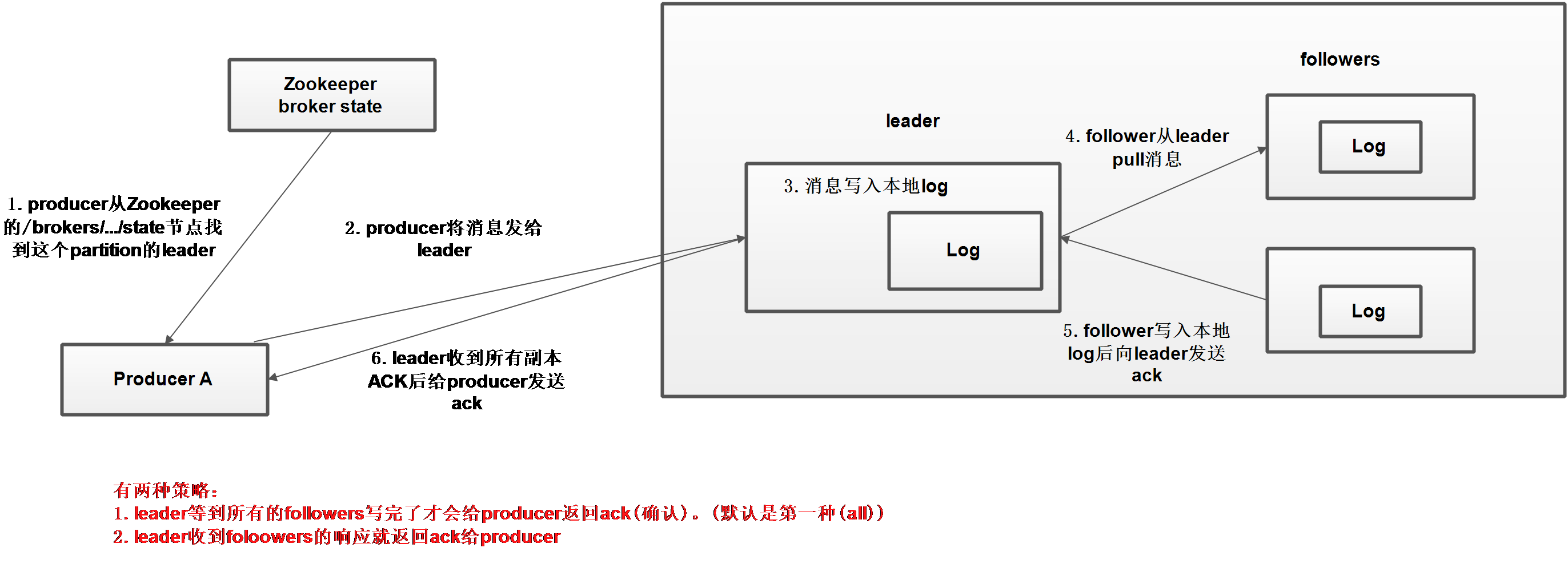 Replication(副本):同一个Partition可能会有有个副本(对应server.properties配置中的default.replication.factory=N),没有副本的情况下,一旦broker挂了,其上所有分区数据都不可被消费了,同时producer也不能将数据存于其上的分区,引入副本后同一个分区可能有个副本,而此时需要再这些副本直接选出一个Leader,producer和Consumer只能这个leader做交互,其他的副本作为follower从leader中复制数据