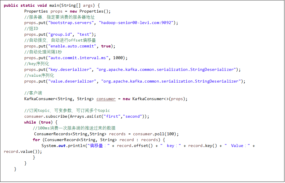 消费消息,消费者(在生产者界面输入内容后回车):bin/kafka-console-consumer.sh --zookeeper hadoop-senior00-levi.com:2181 --from-beginning --topic first