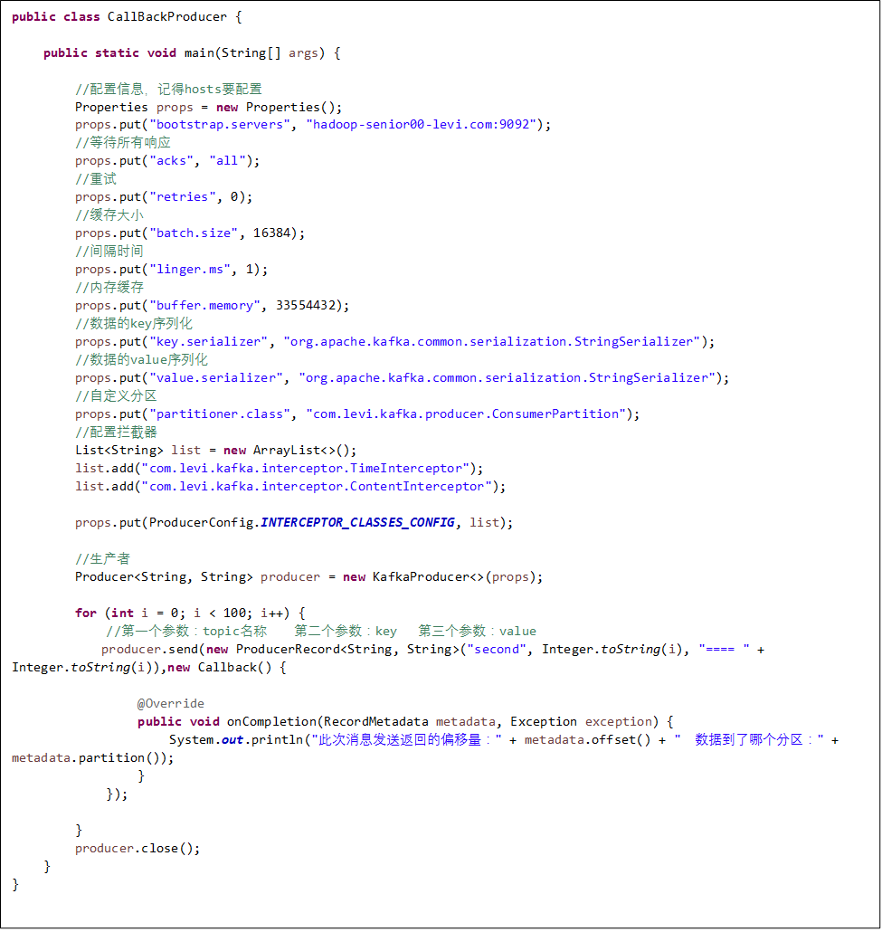 拦截器可能是运行多个线程,因此具体实现用户需要自行保证线程安全,如果指定了多个则producer将按照指定顺序调用。
