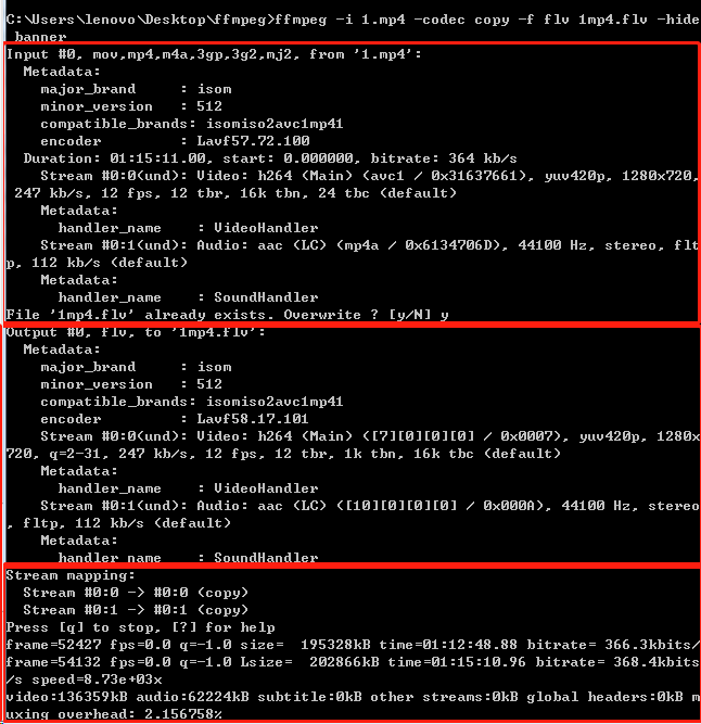 ffmpeg -i 1.mp4 -codec copy -f flv 1mp4.flv -hide_banner