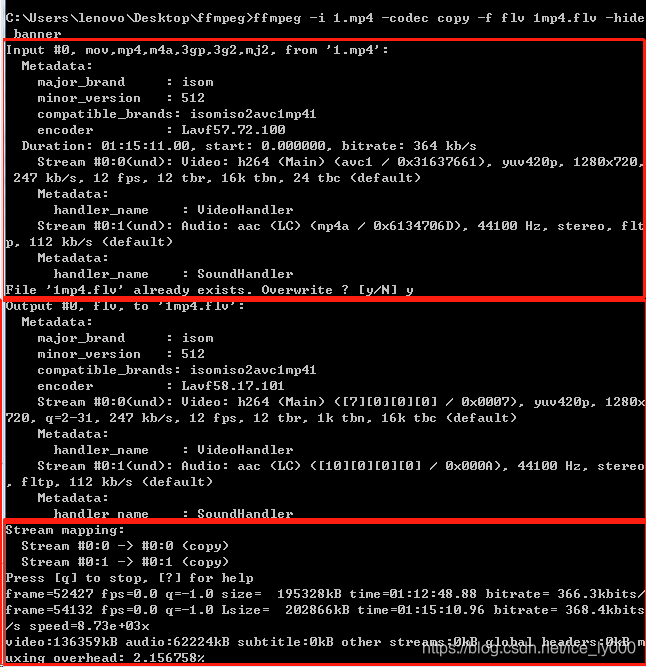 1. 告知了流映射方式,stream #0:0 ->#0:0(copy) 表示第0个输入文件的第0个流 映射 到第0个输出文件的第0个流,方式为copy,即不转码;stream #0:1 ->#0:1(copy) 表示第0个输入文件的第1个流 映射 到第0个输出文件的第1个流,方式为copy,即不转码
