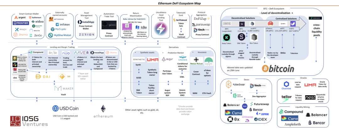 DeFi 生态项目越来越丰富,大家可以访问 https://defiprime.com/ 了解项目背景。给大家分享一张 IOSG Ventures 制作的生态全景图。