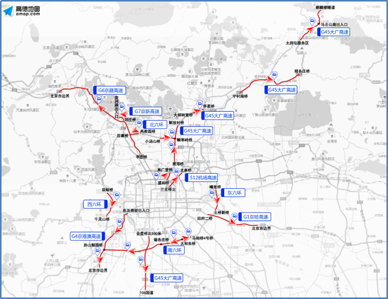 京藏高速清河收费站、沙河大桥、昌平西关、居庸关、野生动物园出口,京承高速望和桥、来广营桥,京港澳高速杜家坎、长阳路段,京开高速玉泉营、新发地等路段都是出京易拥堵的点段;