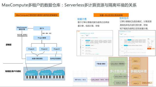 那么,MaxCompute的Serverless如何满足上述的场景和需求呢?如果是一个业务快速发展、快速变化的企业,我们建议使用MaxCompute的Serverless按需使用的计算资源。从管理上来讲的话,我们可以建立不同的Project去做一些隔离的划分,比如说建立一套开发测试环境,一套生产环境。对于有些分析师来讲,他们往往随机地需要对一些明细数据做大量的探索,或做机器学习分析,往往有一些突发的算力需求,且这个算力需求的规模可能非常大,这个时候往往这些作业要和其他的环境隔离,因为他们是低频的,但是却需要对海量数据做分析。