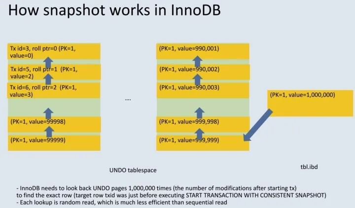 对于InnoDB,由于备份事务id小于更新100万次增一的事务id,因此,这100万个旧版本记录(即undo)都不会被purge,这意味着在对该记录进行备份时,需要执行100万次版本回溯,每次都是基于记录上的undo指针对undo页进行随机读,效率很低。