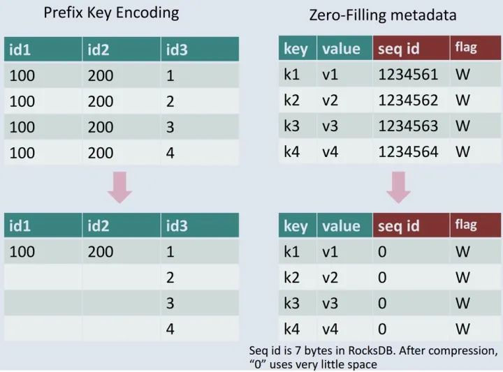 此外,如上图所示,RocksDB在存储时对记录列采用前缀编码。对每行的元数据也采取类似的处理方式。这更进一步减小的所需的存储空间。