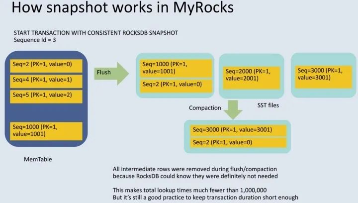 RocksDB针对InnoDB存在的旧版本记录purge问题进行了优化,假设原始记录的sequence number为2,该版本即为备份事务可见版本,对于比它更大的版本,在RocksDB将MemTable dump为sst文件,或对sst文件进行Compaction时会删除中间版本,仅保留当前活跃事务可见版本和记录最新的版本。这样既满足MVCC要求,又提高了快照读效率,同时也减少了需占用的存储空间。