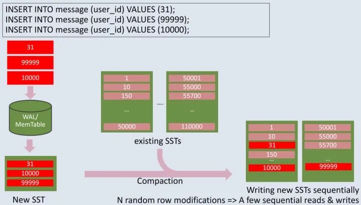 而RocksDB不同,将随机写转换为顺序写,后台进行记录新旧版本合并的多线程Compaction也是批量的顺序写操作。对于批量插入场景,RocksDB也可以关闭记录唯一性检查来进一步加速数据导入速度。