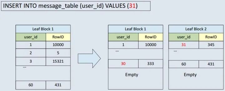 叶子节点Block1在插入user_id=31后触发了节点分裂条件,被从中间拆分为2个Block,每个块占用原Block1约一半的空间,显然每块的填充率不到50%,也就是说此时有一半内碎片。