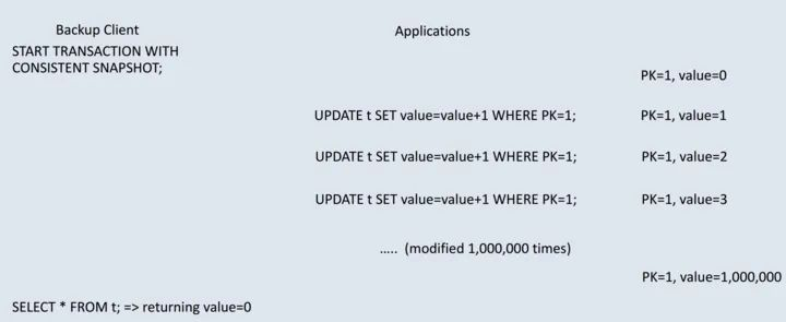 假设对MySQL进行一致性逻辑备份,开启事务但还未对表t执行select操作前对该表主键为1值为0的记录进行100万次增一操作。根据原理,本次备份需要读到值为0的原始记录。