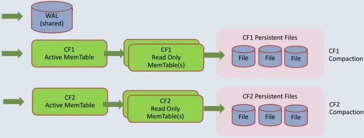 在RocksDB中列族(Column Family)就是在逻辑上独立的一棵LSM树,每个列族都有自己独立的MemTable,所有列族共享一份WAL日志。sst文件的Compaction是以列族为粒度进行的。