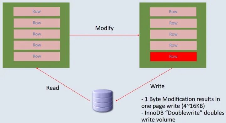 可以看出,一次更新需要写的东西非常多,特别的,如果是随机更新场景,在写数据页和Doublewrite时,写放大的比率是页大小/记录大小,非常惊人。