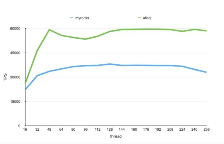 MyRocks采用追加的方式记录DML操作,将随机写变为顺序写,非常适合用在有批量插入和更新频繁的业务场景。下图为阿里云发布的批量插入场景下的性能对比图,相比基于InnoDB的AliSQL,MyRocks获得了近一倍的性能提升。