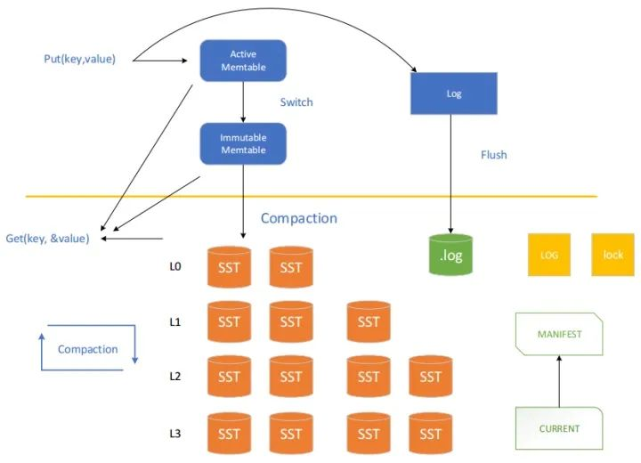 上图就是一个Level0的Compaction,将一到多个Level0的文件跟Level1的文件进行compaction的过程。不管是将内存的MemTable dump到sst文件,还是sst文件之间的Compaction,从IO角度都是顺序读写,这不管在SSD还是HDD上都是有利的,对于HDD可以发挥顺序性能远高于随机性能的特点,对于SSD,可以避免随机写带来的Flash介质写放大效应。