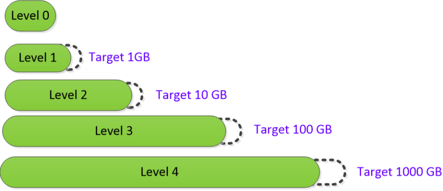 上图所示为RocksDB的写请求示意图,一个事务的修改在提交前先写入事务线程自身的WriteBatch中(在上图示例中事务仅执行一个Put操作,那么WriteBatch中仅有该Put),在提交时被写入RocksDB位于内存中的MemTable中,MemTable本质上是一个SkipList,里面缓存的记录是有序的。和InnoDB一样,事务更改的数据(WriteBatch)在提交前也会先写Write Ahead Log(WAL),事务提交后,只需保证WAL已经持久化即可,MemTable中数据不需要写入磁盘上的数据文件中。当MemTable大小达到阈值后(比如32MB),RocksDB会产生新的MemTable,原来的MemTable会变为只读状态(Immutable),不再接收新的写入操作。Immutable MemTable会被后台的Flush线程dump成一个sst文件。在磁盘上,RocksDB通过一个个sst文件来保存数据,一个个log文件保存WAL日志。在磁盘上,sst文件是分层的,每层多有一到多个sst文件,文件大小基本固定,层级越大,该层的文件数量越多,意味着该层允许的总大小越大,如下图所示。