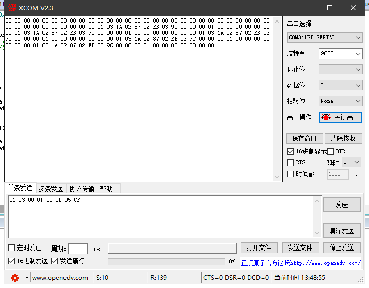 03 9B对应0x0003地址,即风向寄存器,转换成十进制为923,风向=923/10=92.3°