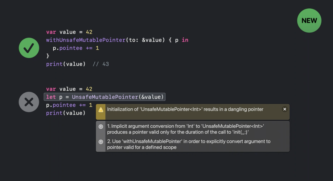 将临时指针传递给可变指针构造方法,会将其值转出初始值设定项调用。访问结果悬垂指针值是未定义的行为:底层内存位置可能不再存在,或者可能已被其他值重用。为了帮助捕获此类错误,Swift 5.3 编译器现在可以在检测到此类情况时发出有用的警告。