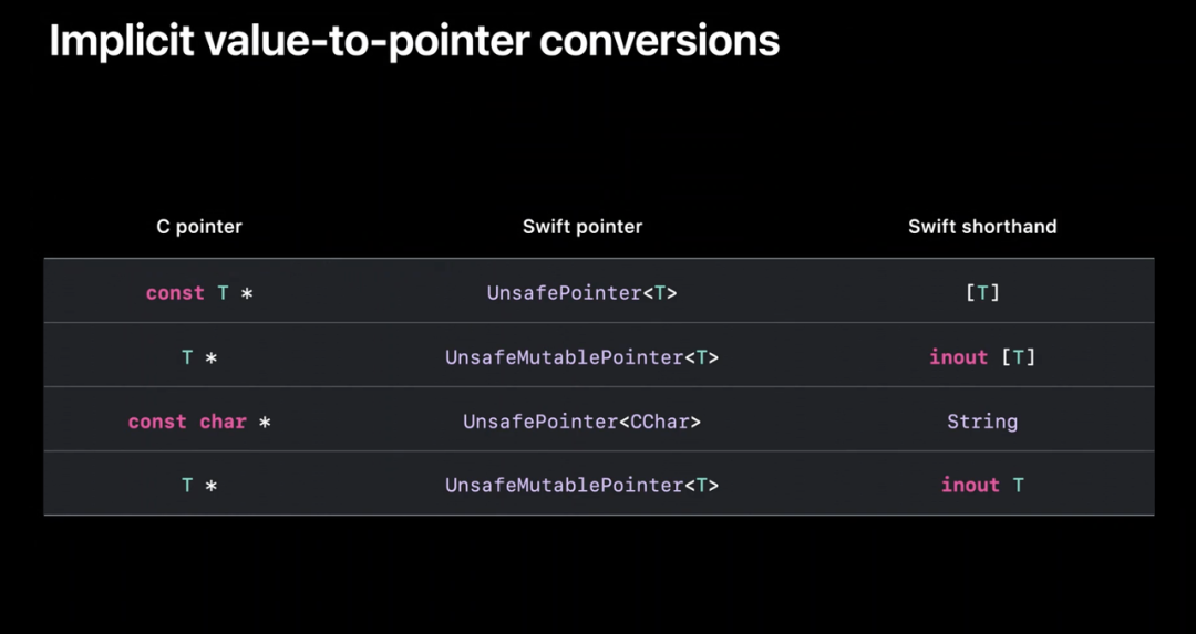 这是 Swift 支持的此类隐式值到指针转换的列表。