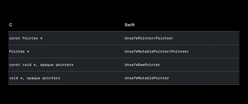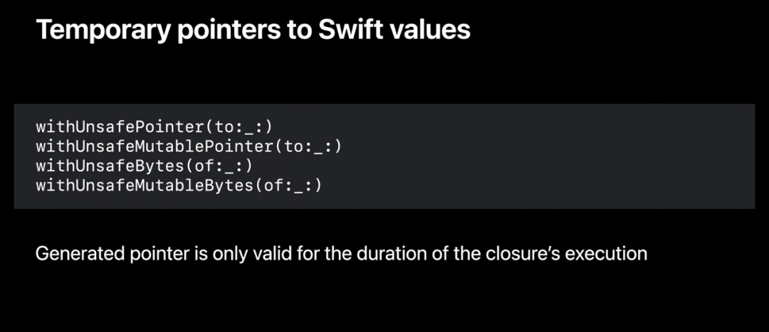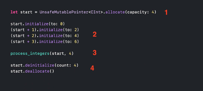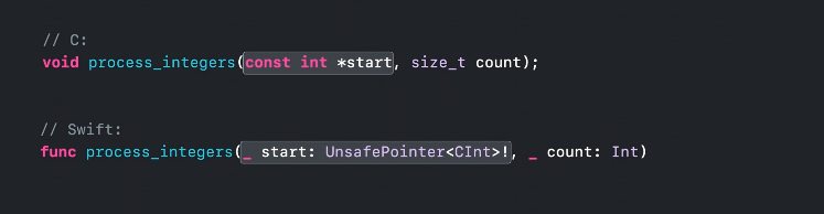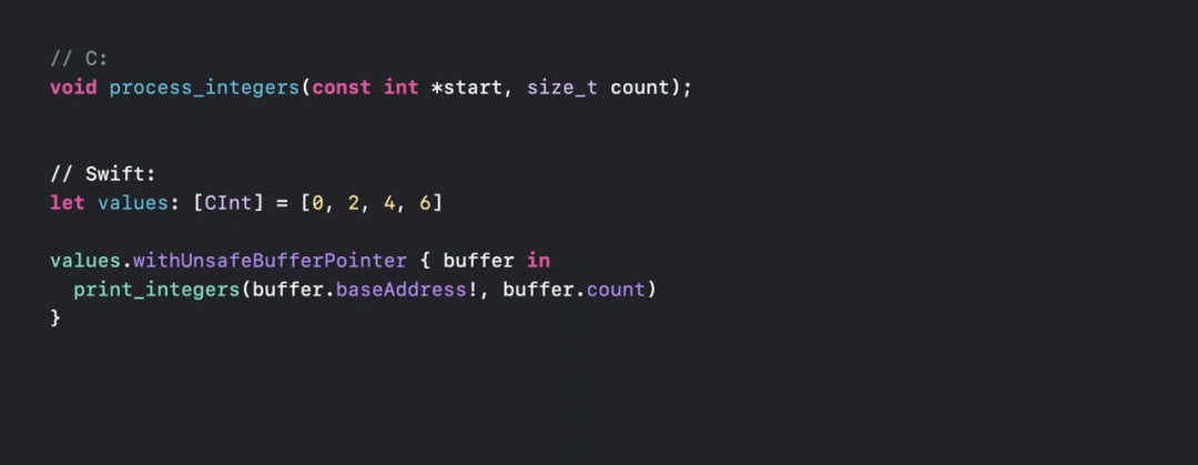 我们可以简单地将数组值传递给需要不安全指针的函数,编译器将自动为我们生成等效的 withUnsafeBufferPointer。但是请时刻记住:指针仅在函数调用期间有效。