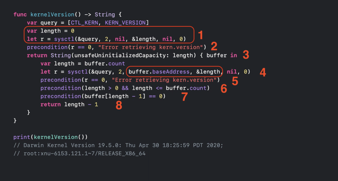 有了结果的大小,我们现在可以要求 String 为我们准备未初始化的存储,以便我们可以获取实际数据。初始化程序为我们提供了一个可以通过 sysctl 函数传递的缓冲点。