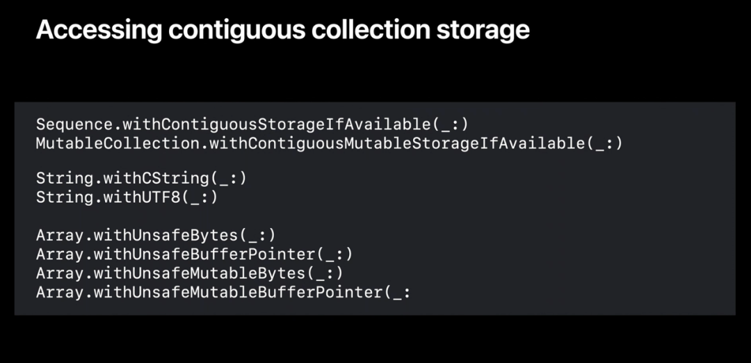 Swift 的标准连续集合使用这些方便的接口去临时直接访问他的基础存储缓冲区。