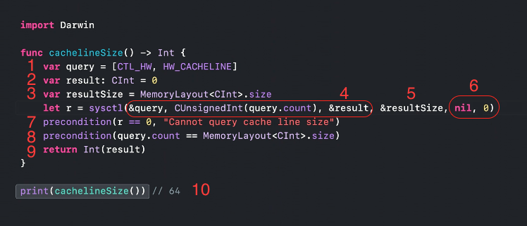 要将这个 ID 传递给 sysctl,我们可以使用隐式 Array 到指针的转换,并使用显式的整数转换来计数。