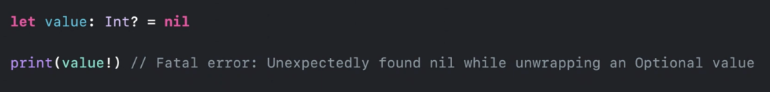 我们知道 value 一定不能是 nil,如果我们将 value 赋值为 nil,然后使用强解操作符,我们的程序会马上 crash。虽然尝试强制展开 nil 值仍然是严重的编程错误,但是因为其后果已得到很好的定义。所以我们可以说强解这个操作是“安全的”,因为我们可以很清楚的知道对于各种输入会有什么表现形式。(包括强解 nil 会 crash)。