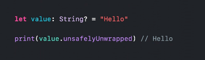 Optional 还通过其 "unsafelyUnwrapped" 属性提供了 "unsafe" 强制展开操作。就像常规的强制展开运算符一样,这也要求基础值必须为非零。