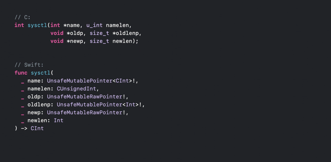 这接口看起来有点吓人。但是,从 Swift 调用此函数不一定像在 C 语言中那么复杂。在这里,隐式指针转换能让我们的代码在看起来和当前其他 Swift 代码没什么区别。