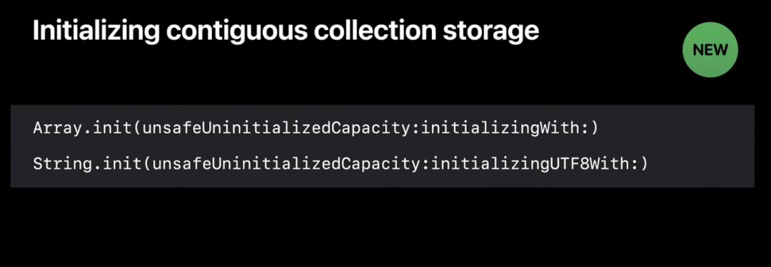 另一项改进是,Swift 标准库现在提供了新的构造方法,该构造方法允许我们通过将数据直接复制到其底层未初始化的存储区中来创建 Array 或 String 值。