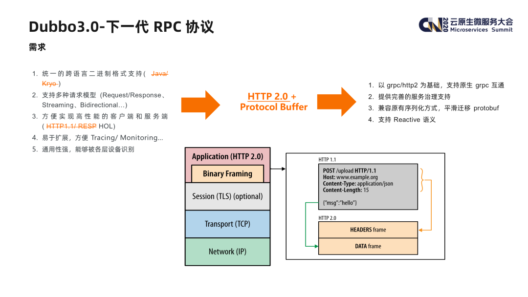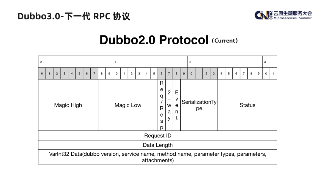 大家可以看到,这是 Dubbo2.0 的协议。从功能上看, Dubbo2.0 提供了 RPC 的核心语义,包括协议头、标志位、请求 ID 以及请求/响应数据。在云原生时代,2.0 协议主要面临两个挑战: