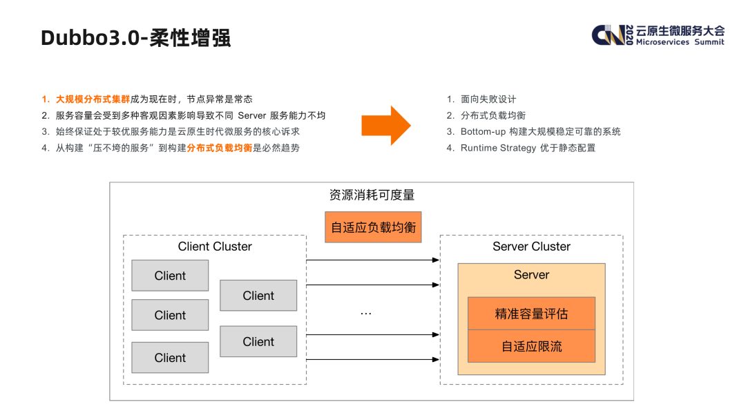从方法上看,Dubbo3.0 的柔性增强会以面向失败设计为理念,提供包括精准容量评估、自适应限流、自适应负载均衡的支持,自底向上的分步构建大规模可靠应用。从单一服务的视角看,服务是压不垮的,稳定的。